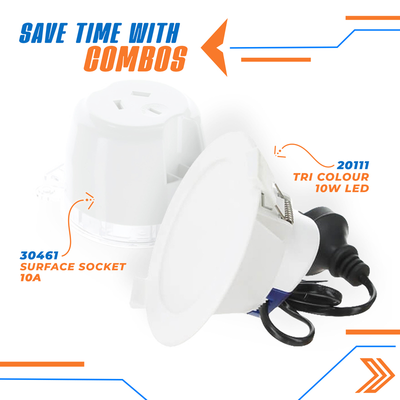Learn more by watching our NLS 20111-30461-Combo | 10W Tri Colour LED Dimmable White Downlight + 30461 10amp Surface Socket Combo video.