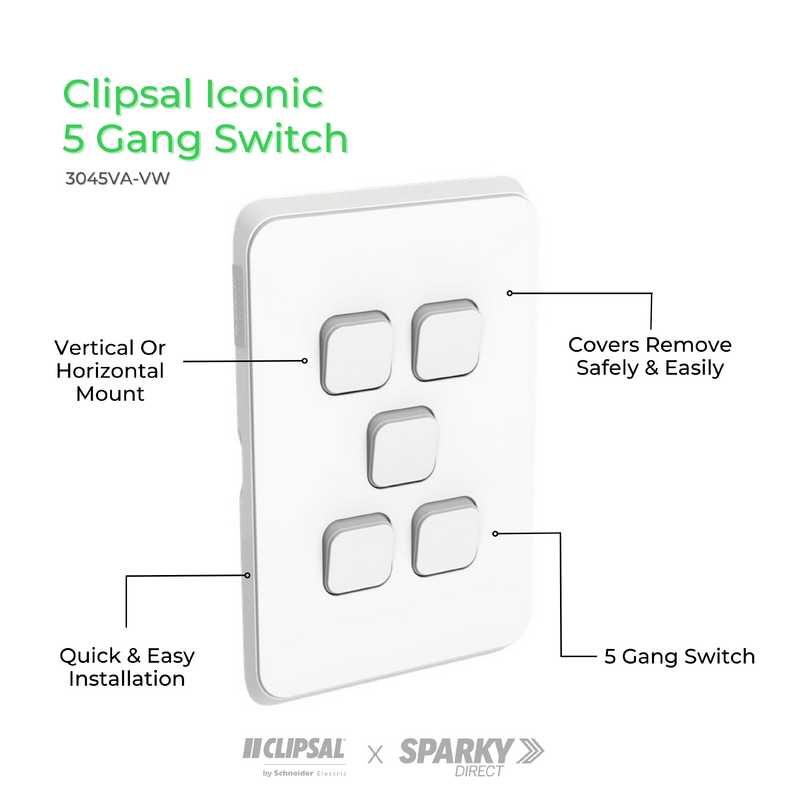 Learn more by watching our Clipsal Iconic 3045VA-VW | Switch 5 Gang 10Amp | Vivid White video.