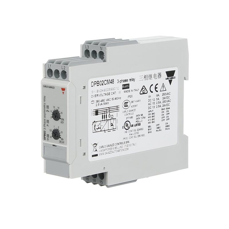 The Carlo Gavazzi DPB02CM48 monitoring relay is a three-phase monitoring relay used for phase sequence, phase loss and asymmetry with a built-in time delay function.