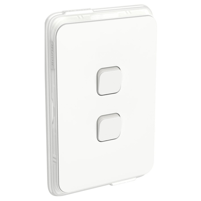 This 2-gang switch has an IP rating of IP44. It is excellent for wet areas such as kitchens, Laundries, outside/exterior