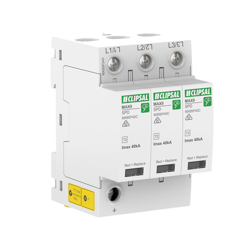 The Clipsal MX9SP340 MAX9 surge protection device is a modular surge arrester. It is a 3 Pole surge arrester. It has 1 position switch with contacts type 1 NO + 1 NC.