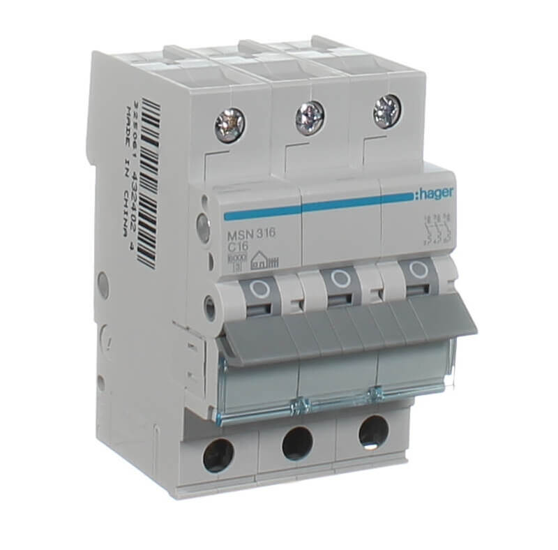 The Hager MSN316 is a three pole circuit breaker which protects and control circuits against overloads and short-circuits. The MSN316 circuit breaker is rated at 6kA and is suitable for commercial and domestic applications.