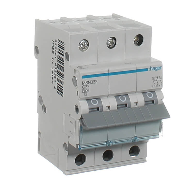 The Hager MSN332 is a three pole circuit breaker which protects and control circuits against overloads and short-circuits. The MSN332 circuit breaker is rated at 6kA and is suitable for commercial and domestic applications.