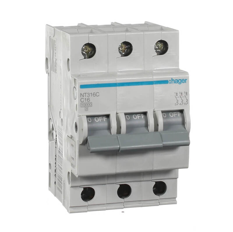 The Hager NT316C is a three pole circuit breaker which protects and control circuits against overloads and short-circuits. The NT316C circuit breaker is rated at 10kA and is suitable for commercial and domestic applications.