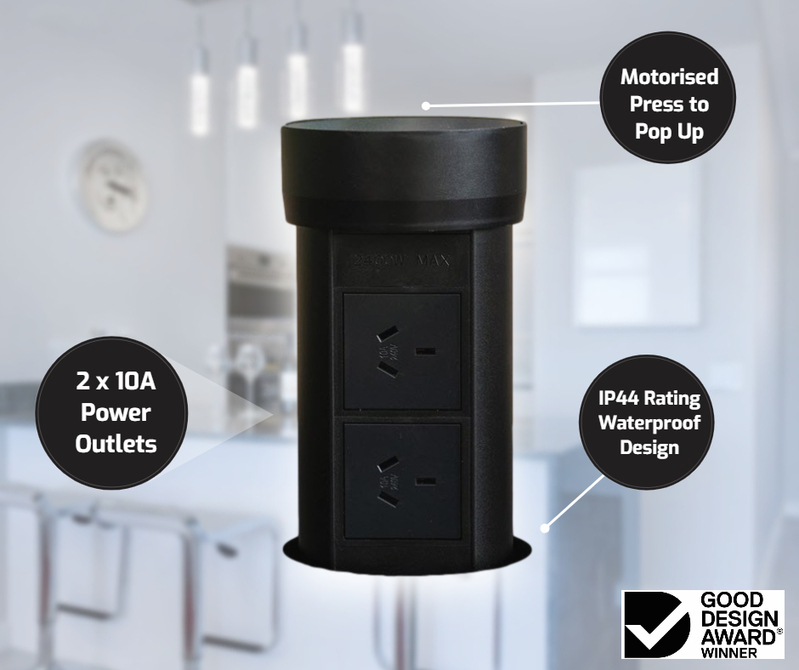The Point Pod PPC1B is a Pop-Up Power Outlet utilises the current bench top material to create a flush seamless finish when not in use. Built in safety features ensure the outlet will not close with plugged in cords and in the case of spillages the liquid is dispersed away from the power points.