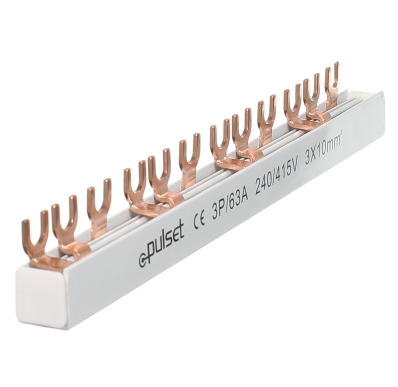 The Pulset BP12-3U is a 12 pole 3 phase fork style copper busbar with plastic insulation on the body. It is designed for 3 phase connection. The fork style busbar reduces wiring effort, makes for a safer installation as it prevents hot spots and can be installed faster than looping building wire.
