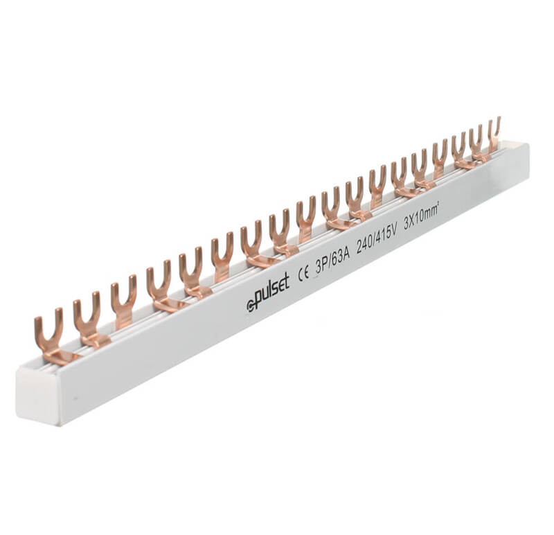 The Pulset BP18-3U is a 18 pole 3 phase fork style copper busbar with plastic insulation on the body. It is designed for 3 phase connection. The fork style busbar reduces wiring effort, makes for a safer installation as it prevents hot spots and can be installed faster than looping building wire.