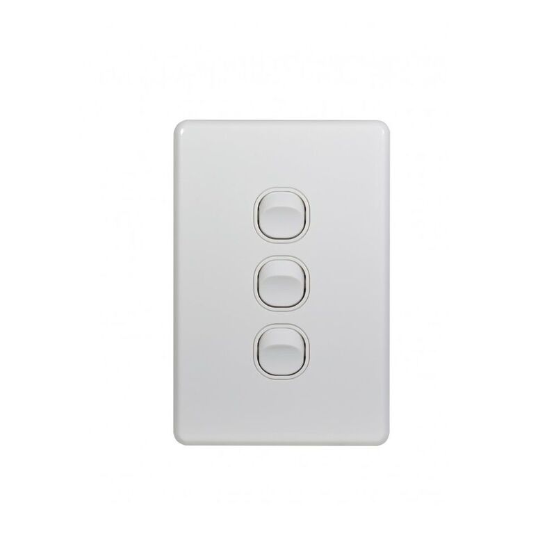 The Trader Flat Cat FLSWV3G 3 Gang 16A Vertical Slimline Switch in white is used throughout Australia in domestic and commercial properties and fits standard Australian wall boxes and mounting accessories that use 84mm mounting centres.
