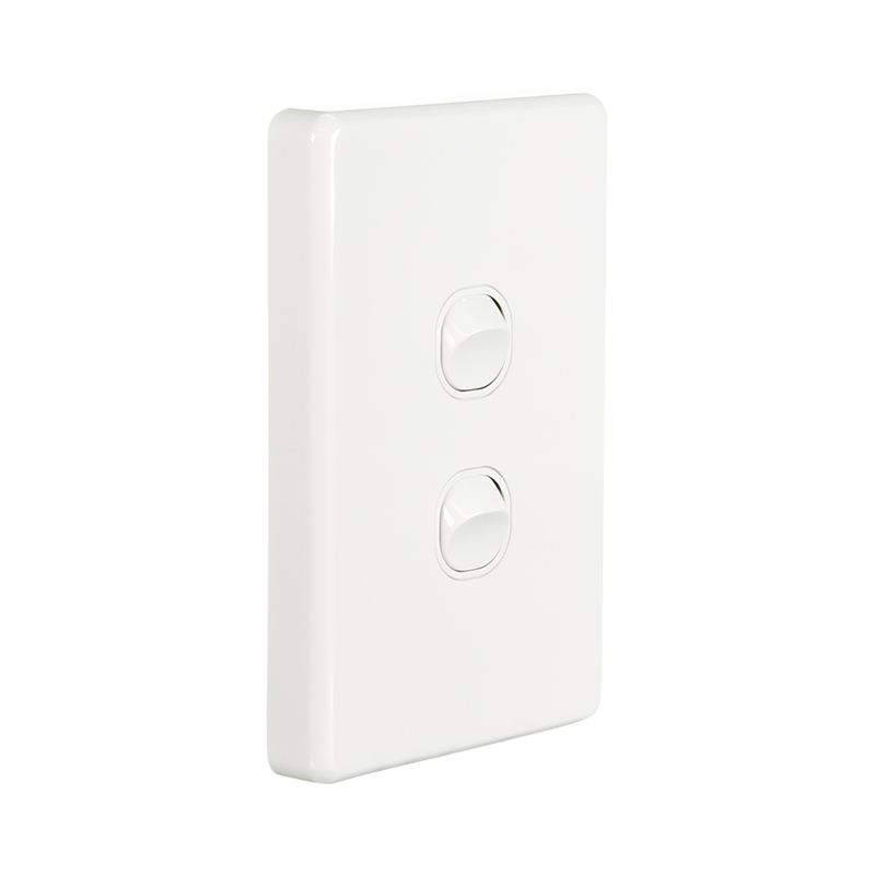 The Trader Puma PUSWV2G 2 Gang 16A Vertical Switch in white is used throughout Australia in domestic and commercial properties and fits standard Australian wall boxes and mounting accessories that use 84mm mounting centres.