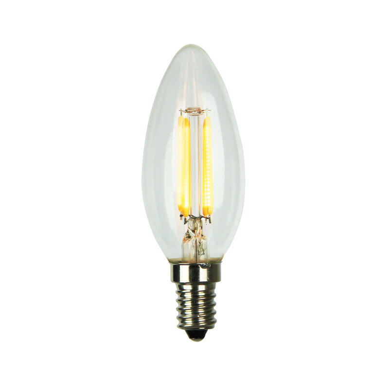 The Allume A-LED-25104427 is a 4W LED filament candle globe with a classic C35 shape. It has clear glass and exposed filaments, giving it the look of a traditional halogen candle bulb. Perfect for chandeliers, wall sconces, and other decorative fittings in homes, cafes, and restaurants.