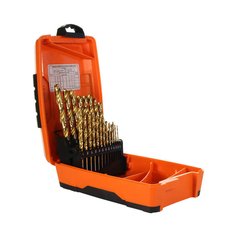 The Alpha SI21PB TUFFBOX Gold Series Drill Bit Set includes 21 high-quality drill bits ranging from 1/16" to 3/8" in 1/64" increments, engineered for durability and precision. This set is housed in a robust plastic case with rugged rubber grips and is built to withstand the demands of any job site. The secure locking catch ensures the bits remain in place, while the internal feeds and speeds chart helps you optimize performance for each task.