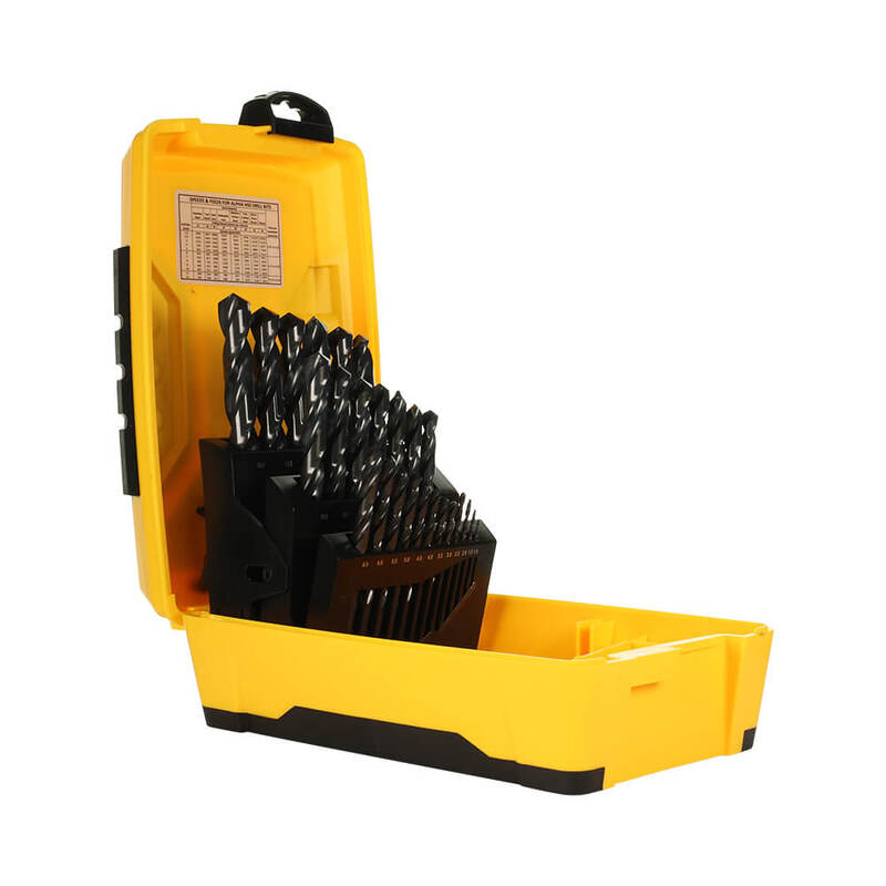 The genuine Alpha Black Series jobber drill bits are crafted for high performance, featuring a 118° Split Point for accurate drilling. Suitable for use on stainless steel, tool steel, cast iron, medium carbon steel, aluminium, brass, wood, and plastic, this set also includes a feeds and speeds chart for optimized usage.