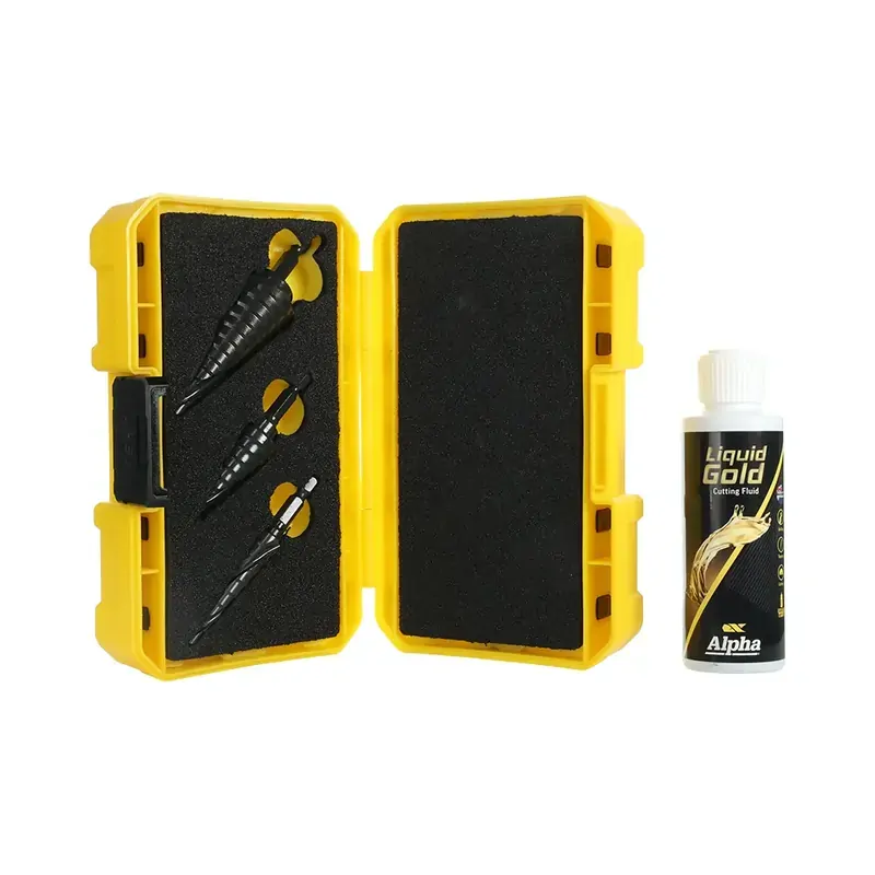 Learn more by watching our Alpha SM3SDTP-B | ThunderMAX Step Drill Tuffbox Set With 120ml Liquid Gold Lubricant | 3 Bits video.