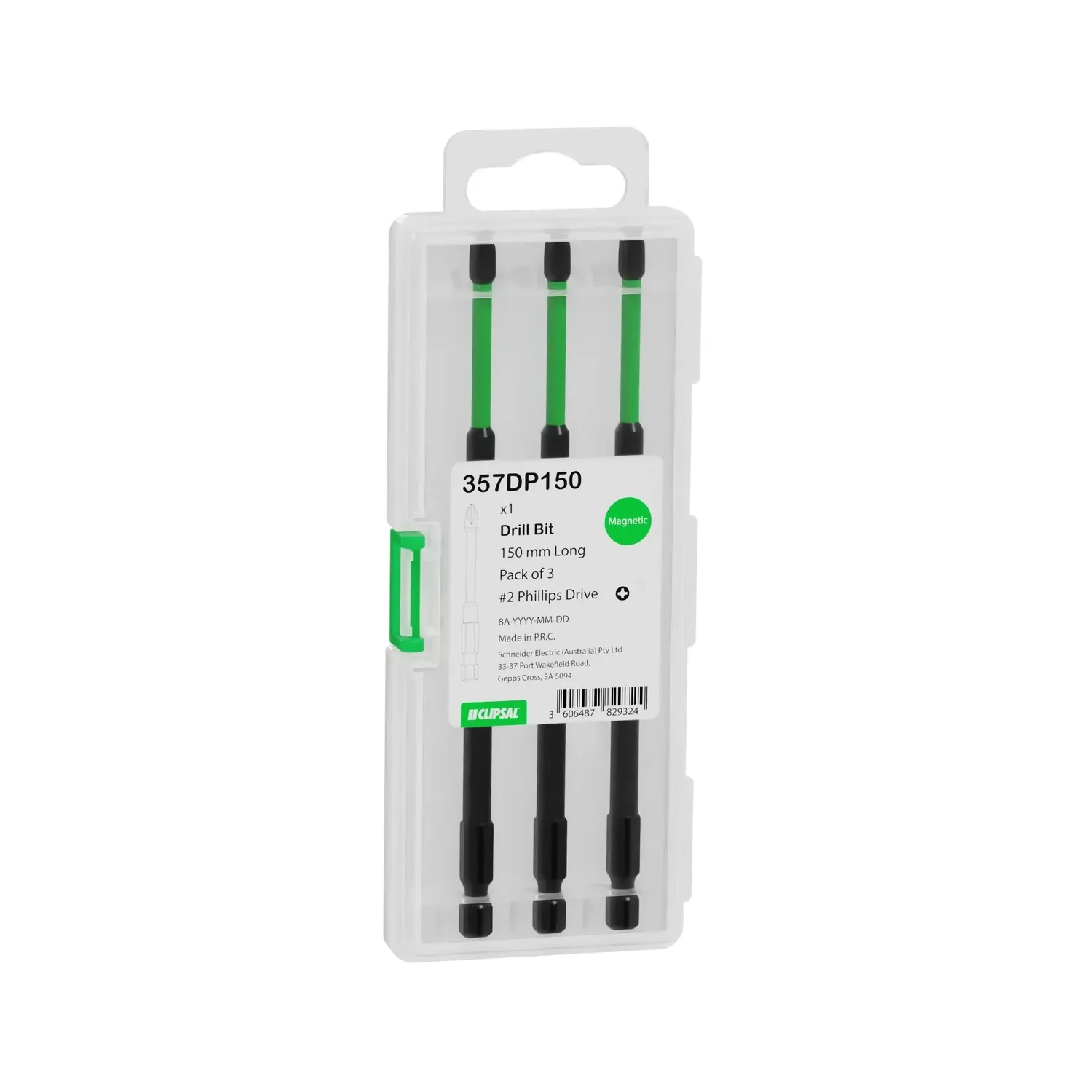 The Clipsal 357DP150 is a 150mm long PH2 driver bit set designed for deep access and magnetic screw retention in electrical and general construction applications. Made from carbon steel with a blackened finish, each bit features a magnetic tip that securely holds screws, improving control for overhead or one-handed fastening.