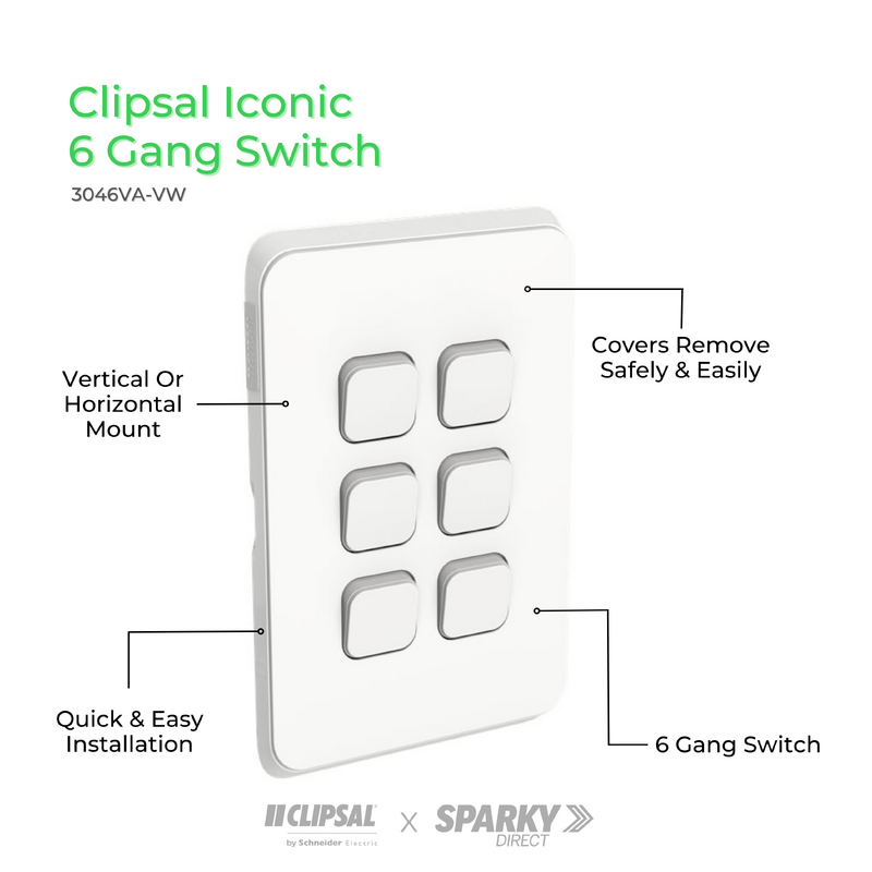 Learn more by watching our Clipsal Iconic 3046VA-VW | Switch 6 Gang 10Amp | Vivid White video.