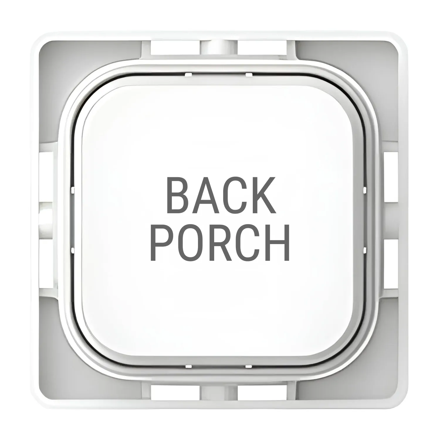 The Clipsal Iconic SD-BACK-PORCH-TEXT-PB-VW is a Custom Engraved Back Porch text push button dolly designed in-house by Sparky Direct.