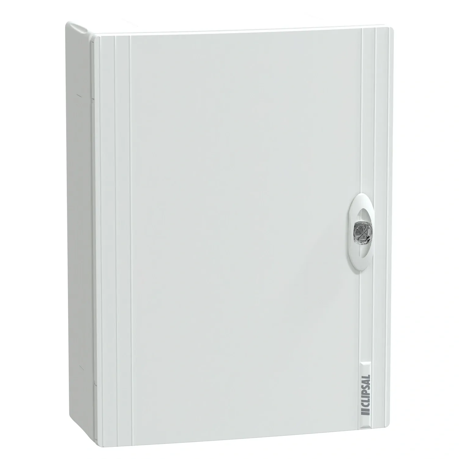 Designed for surface mounting, the enclosure features a reversible door and IP40 protection, making it suitable for indoor use. The white finish and compact layout support a clean and organised installation.