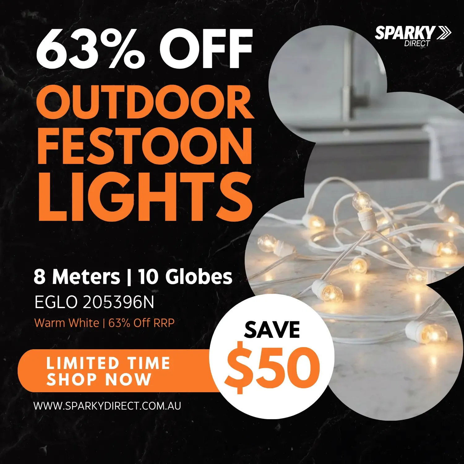 The EGLO 205396N Festoon Light Kit is an 8-metre outdoor string-lighting solution designed to create warm, inviting spaces. It includes 10 replaceable 12V E27 LED globes and a 5 metre lead cable for flexible installation.