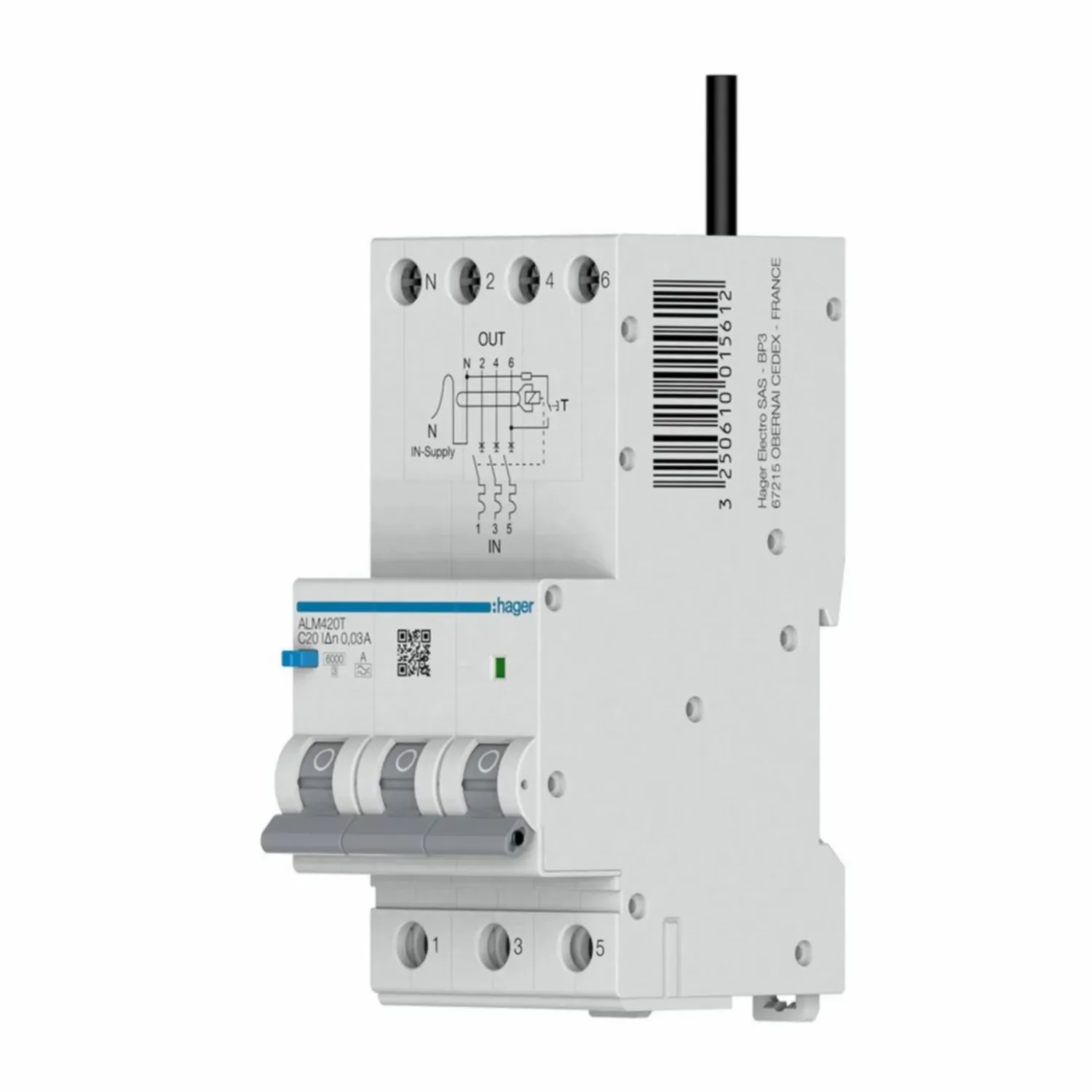 The Hager ALM420T is a 3P+N RCBO that provides combined overcurrent and earth leakage protection in a space-saving 3-module design. Rated at 20A, Type A, and 30mA with a C-curve tripping characteristic, it’s built for 400-415V AC three-phase systems commonly used in commercial and light-industrial environments.