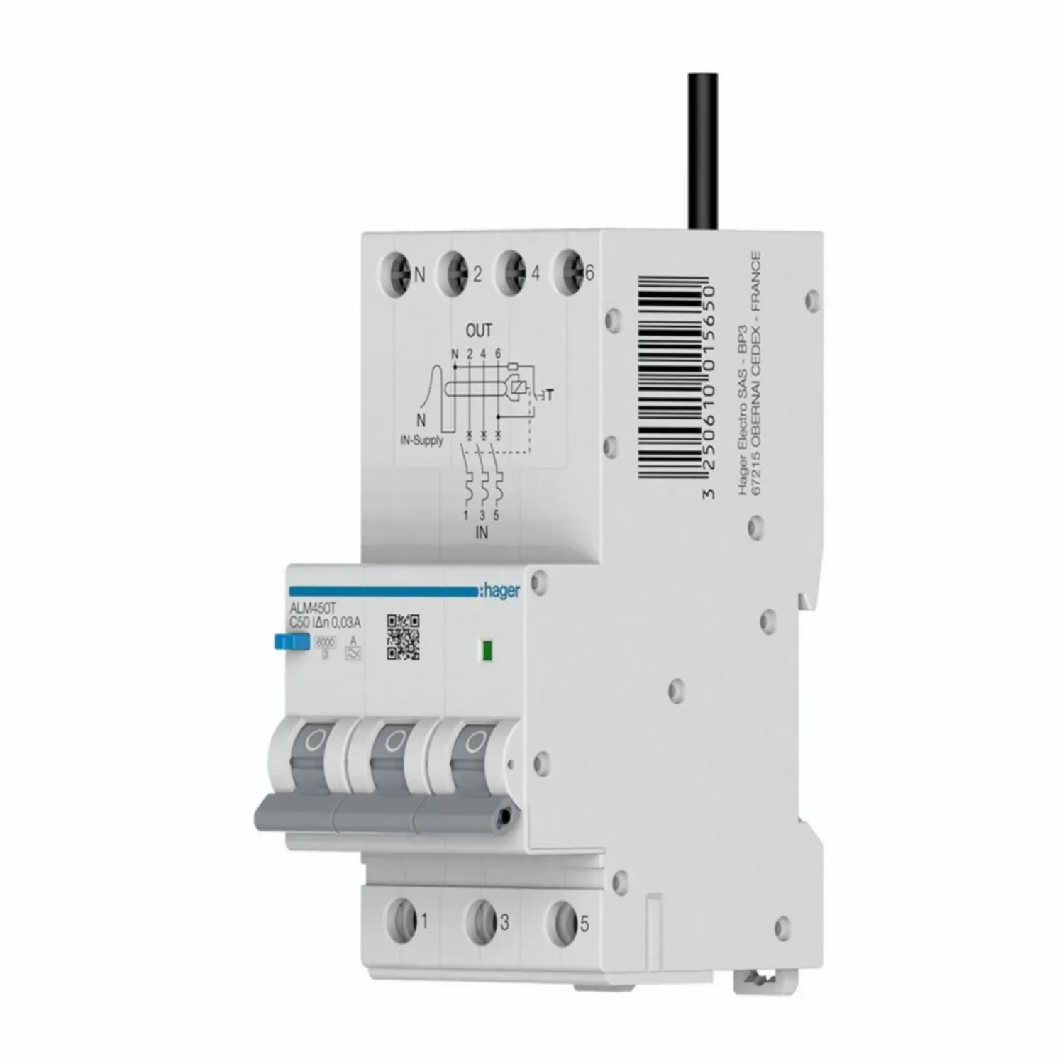 Hager ALM 3 Pole RCBOs are used to provide combined overcurrent and residual current protection for three-phase electrical circuits in residential, commercial, and light industrial installations.