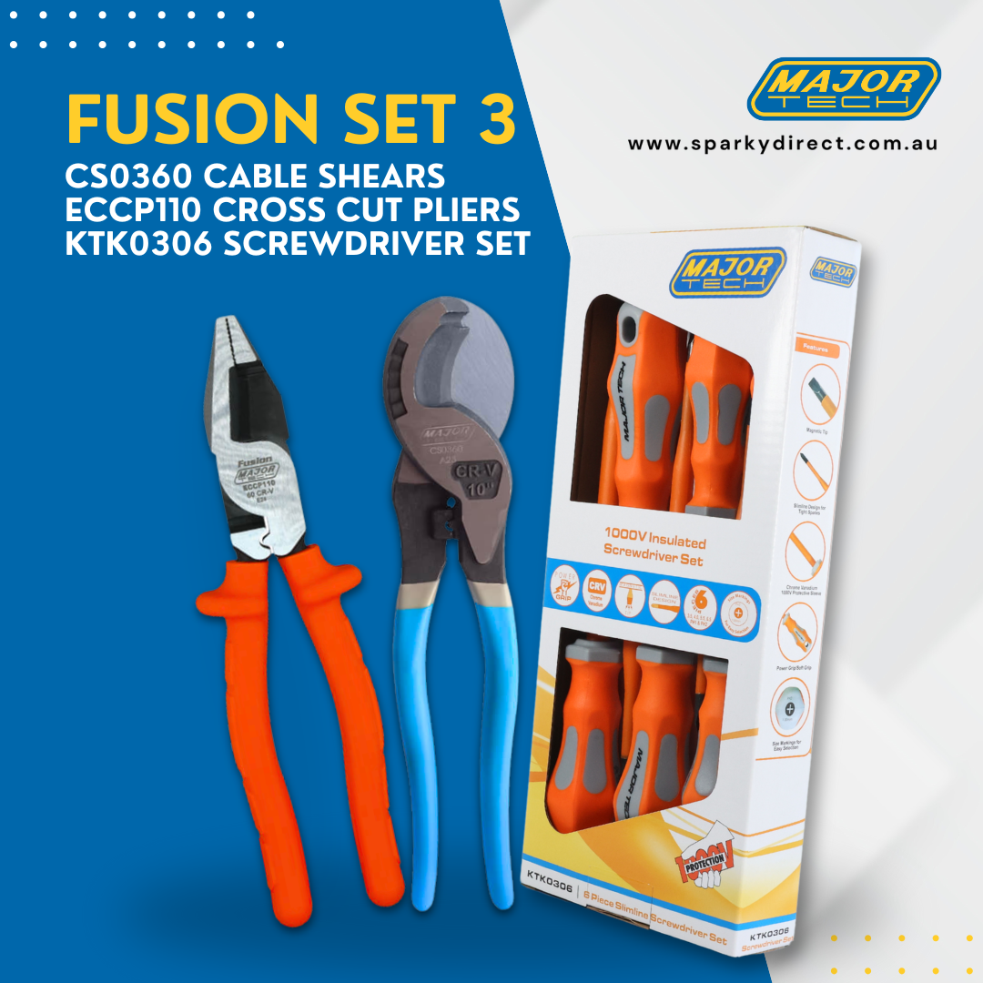 The Major Tech FUSION-SET-3 is a versatile kit for electricians, combining precision cutting, crimping, and fastening tools in one compact set. It includes the CS0360 Cable Shears, ECCP110 Pliers, and KTK0306 6-Piece Slimline Screwdriver Set for reliable on-site performance.