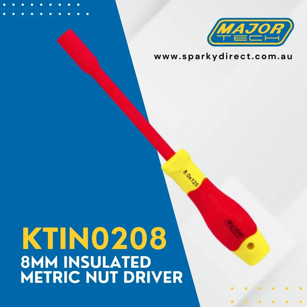 The KTIN0208 Insulated Nut Driver is rated for electrical work up to 1000V AC and tested to 10,000V. It features an 8mm shaft with a 125mm blade length and complies with EN 60900 safety standards. A reinforced polypropylene handle provides durability and comfort, making it ideal for low-voltage, professional use.