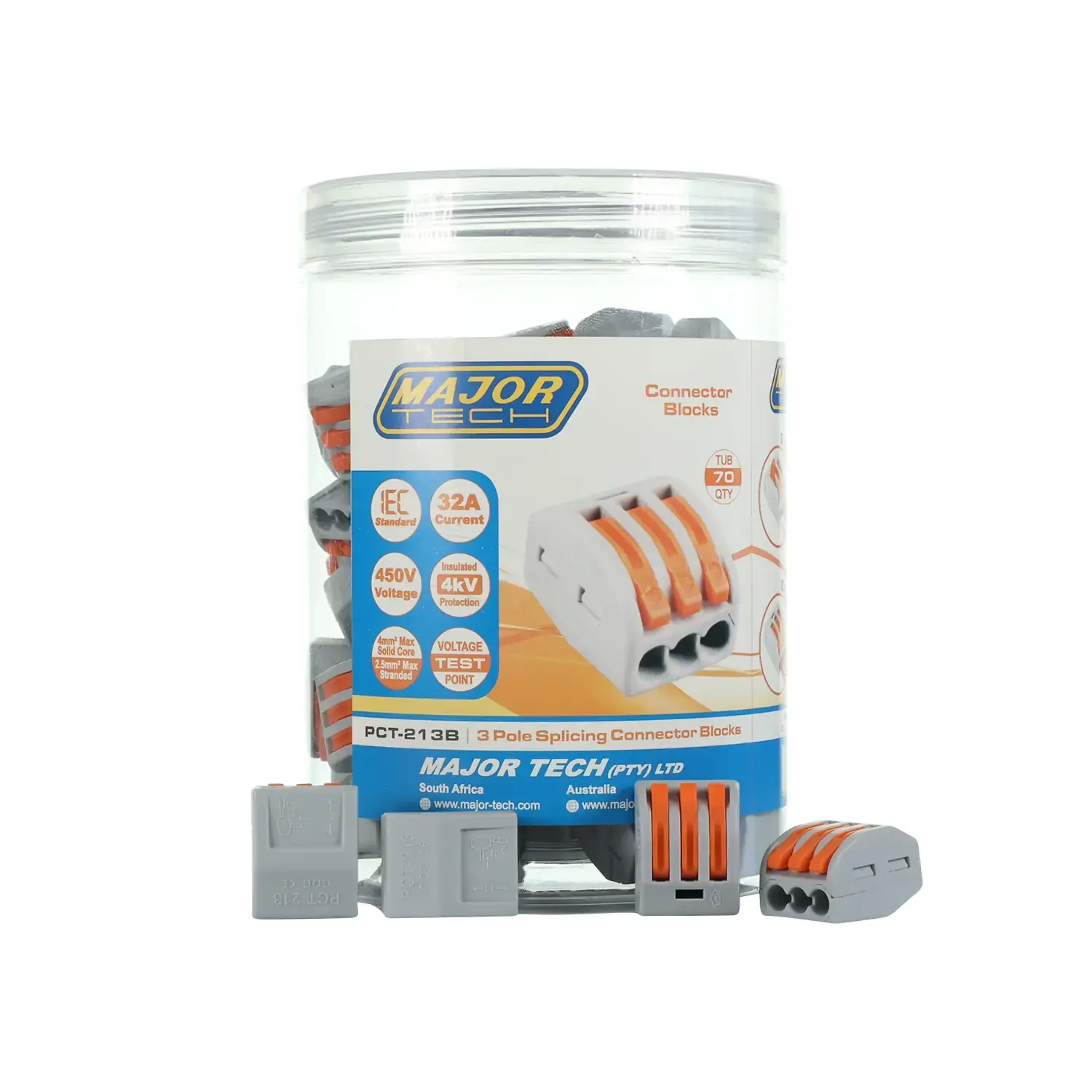 The Major Tech PCT-213B is a 3-pole screwless splicing connector built for fast, reliable, and tool-free wiring. Designed to simplify installs in tight switchboards or junctions, it’s perfect for electricians working on fast-paced jobs or quick maintenance tasks.