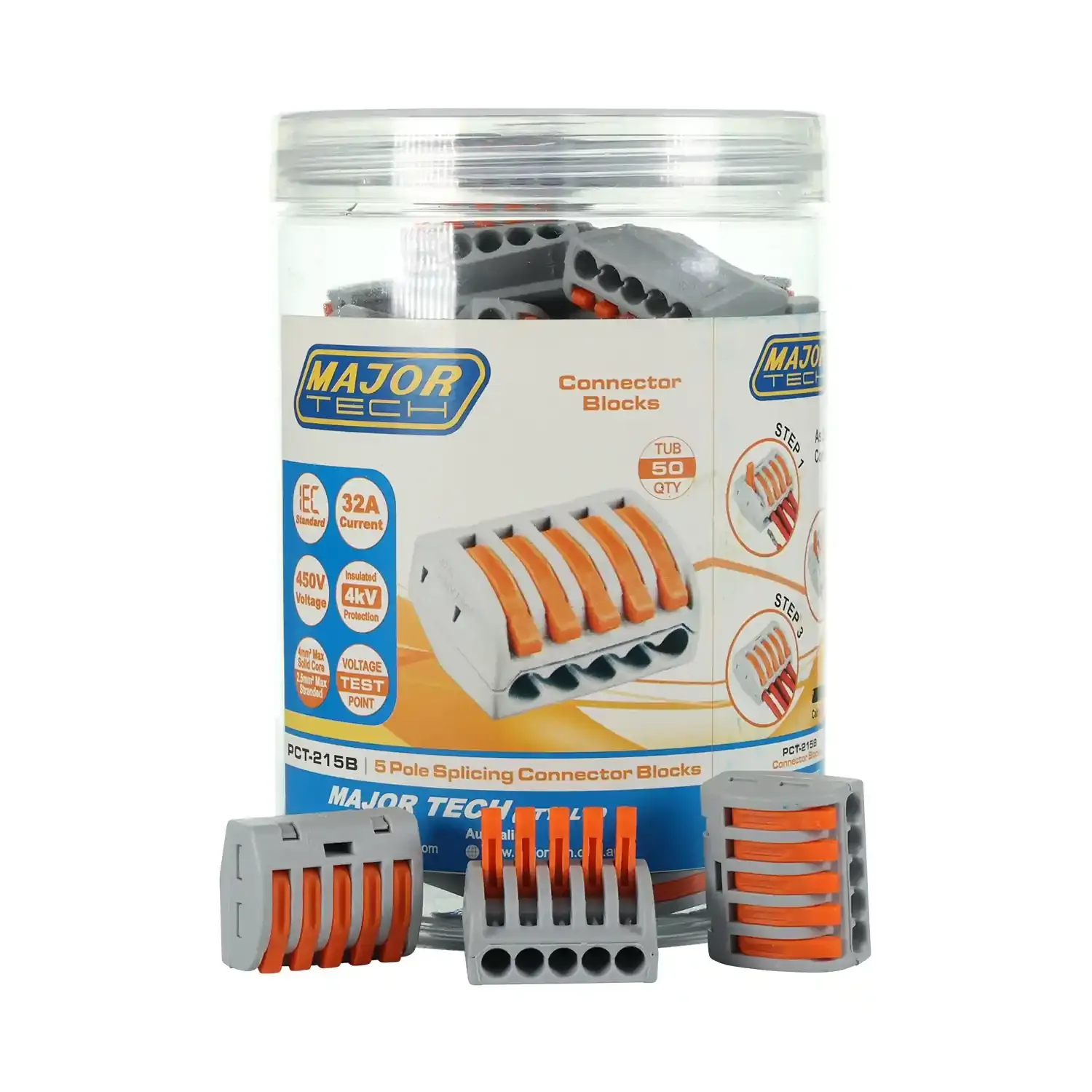 The Major Tech PCT-215B is a 2.5mm² 5-pole splicing connector block supplied in a jar of 50. Designed with a screwless clamping system, it provides fast, secure, and reusable connections ideal for linking multiple conductors in residential, commercial, and industrial applications. It delivers safe and reliable performance for professional electricians.