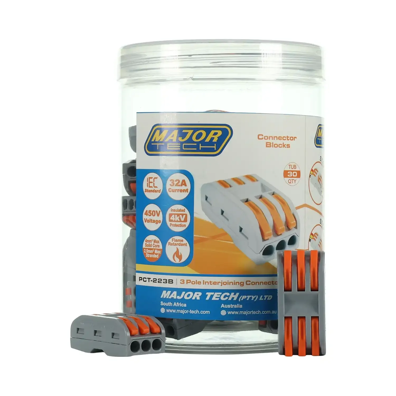 The Major Tech PCT-223B is a 2.5mm² 3-pole interjoining connector block supplied in a jar of 30. Featuring a screwless clamping system, it enables fast, secure, and reusable connections—ideal for electricians needing efficient wiring solutions. It ensures safety and performance across residential, commercial, and industrial environments.