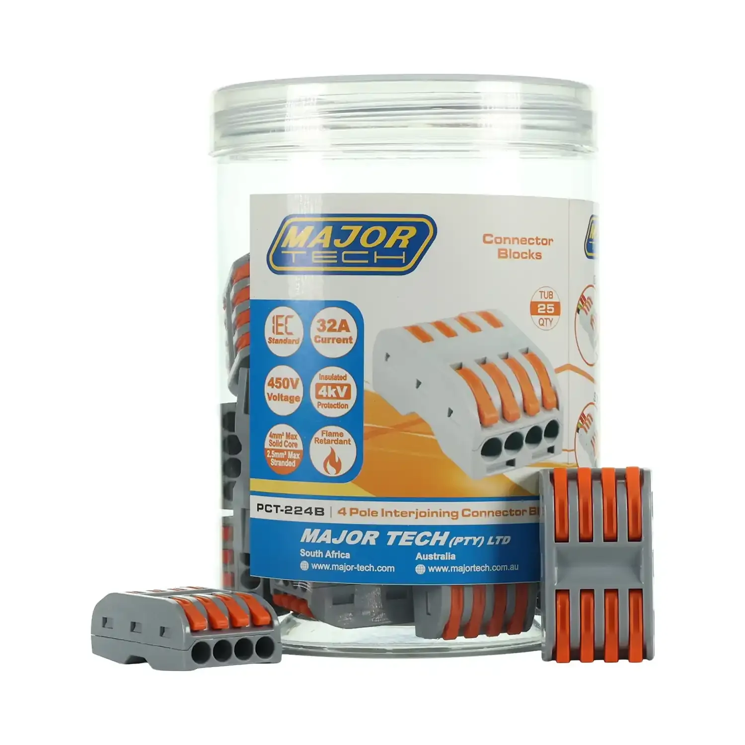 The Major Tech PCT-224B is a 2.5mm² 4-pole interjoining connector block supplied in a jar of 25. It features a screwless clamping system that provides fast, secure, and reusable connections, helping electricians reduce wiring time while maintaining high safety standards. It is suitable for residential, commercial, and industrial wiring projects.