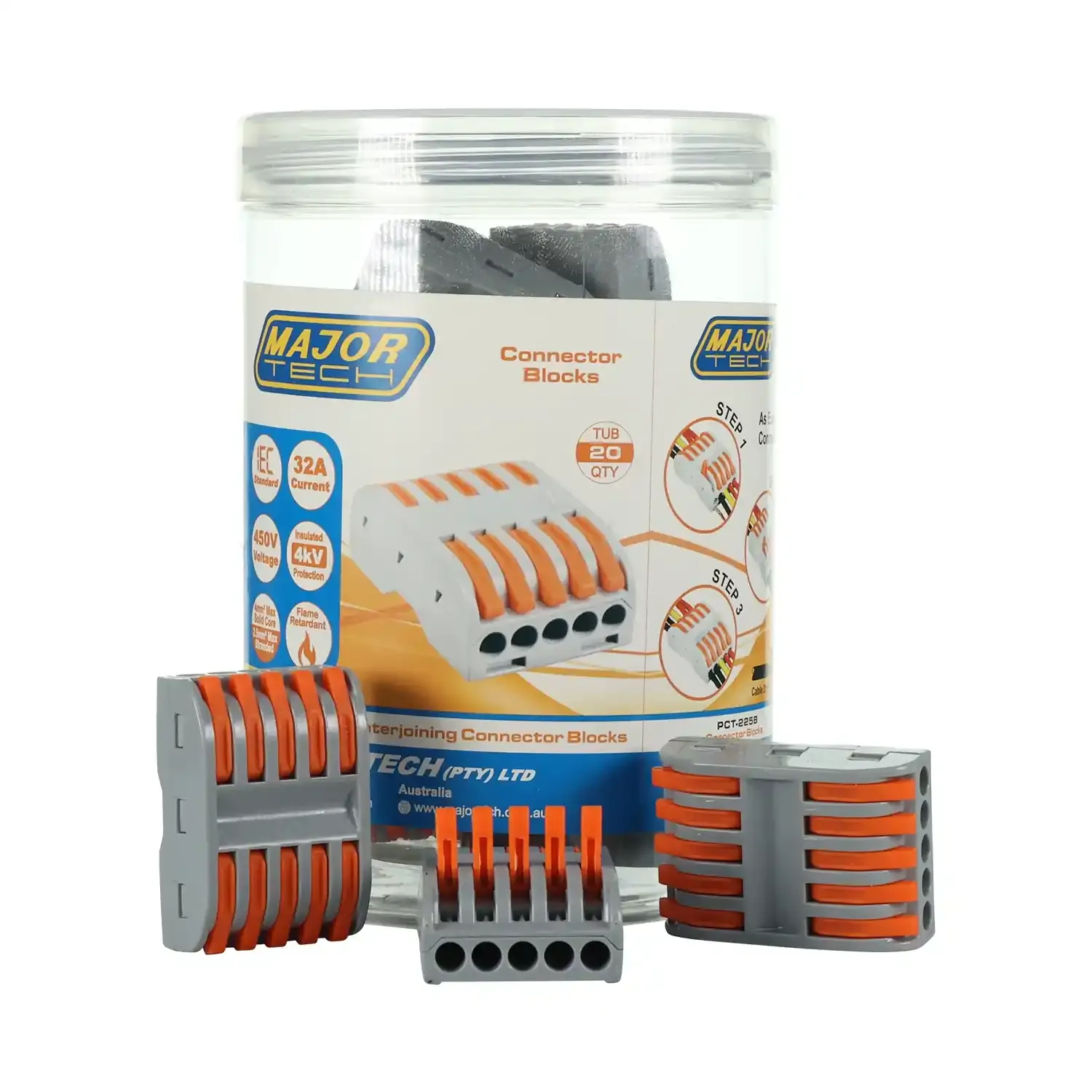 The Major Tech PCT-225 is a 2.5mm² 5-pole interjoining connector block supplied in a jar of 20, designed for quick, secure, and reusable connections. It features a screwless clamping system that speeds up installation while maintaining a reliable electrical connection. Built for professional use, it is ICE Standard Approved to meet compliance standards.