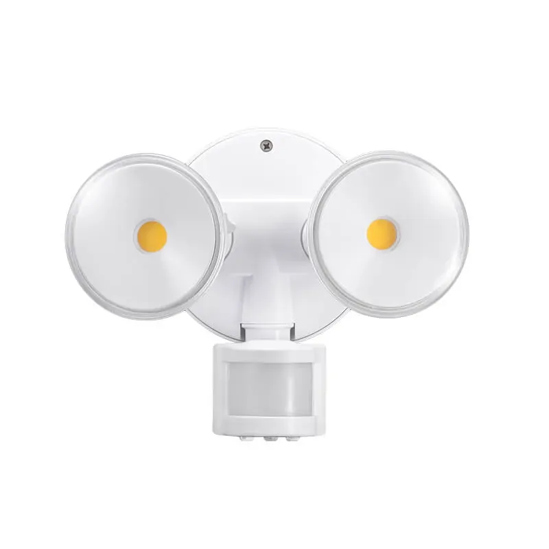 It is a 20W twin head LED spotlight with a built-in PIR motion sensor. It delivers 2400 lumens of 5000K cool white light for outdoor security and general lighting.