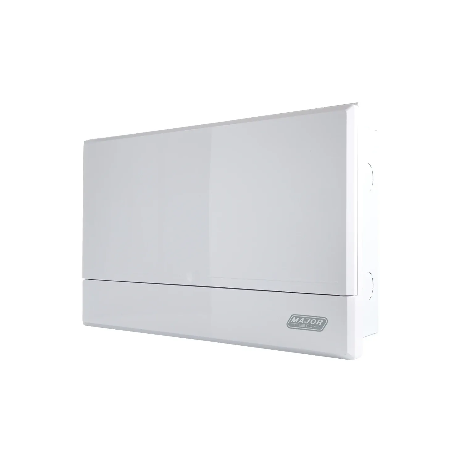 The Major Tech VBM1114FLA is a 12-pole flush mount switchboard with a single-row height, offering space for up to 14 x 18mm modules. It features an adjustable DIN rail and front cover for quick, level installation, and a push-to-open mechanism that ensures a flat, modern finish when closed.