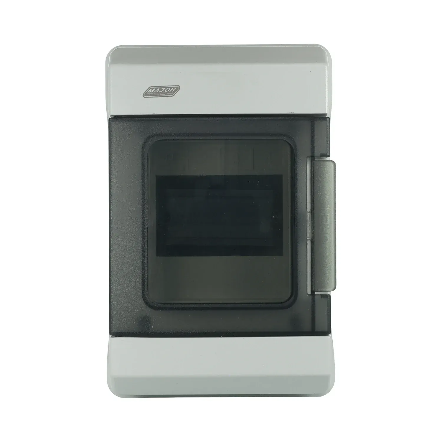 The Major Tech VBW4SA is a 4-pole surface mount switchboard with an IP66 rating and IK08 impact resistance, designed for reliable electrical distribution in demanding environments. With a single-row DIN rail layout, it accommodates up to four 18mm modules, ideal for compact installations where strength, safety, and weather protection are critical.