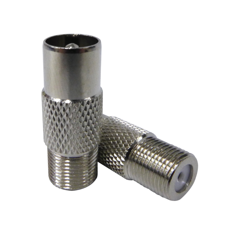 The Matchmaster 08MM-A2 adaptor is designed to convert an F-type female connector to an IEC (PAL) male connection. It features a durable all-metal body with a nickel-plated finish, providing long-lasting corrosion resistance. Installation is simple with no tools required, making it suitable for quick connection changes.