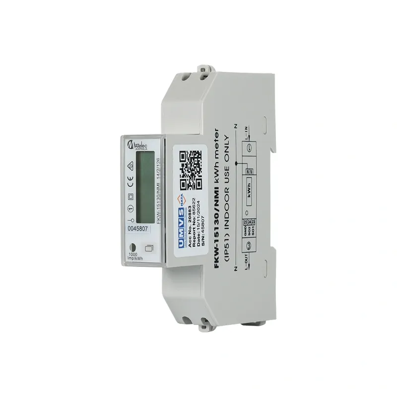 Constructed with durable, fire-resistant ABS housing and rated at IP51, the FKW-15130-NMI is built to withstand challenging environments. Its wide operational current range of 0.25–100A, overcurrent withstand of 1000A for 0.1 seconds, and Class 1 accuracy guarantee precision. Designed for 230VAC at 50–60Hz, this 1-module meter is easy to install on a DIN rail and includes indicators for mains power and load consumption.