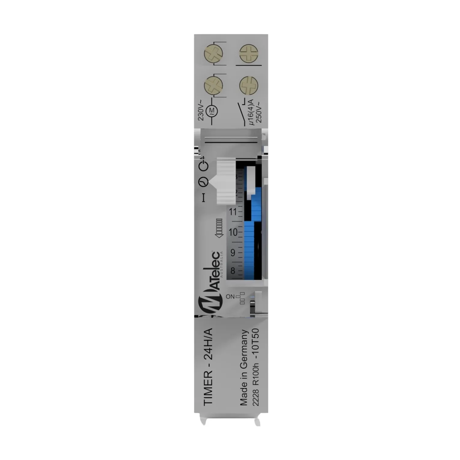 The Matelec TIMER-24H-A is used to automatically switch electrical circuits on and off over a 24-hour period in switchboards and control panels.