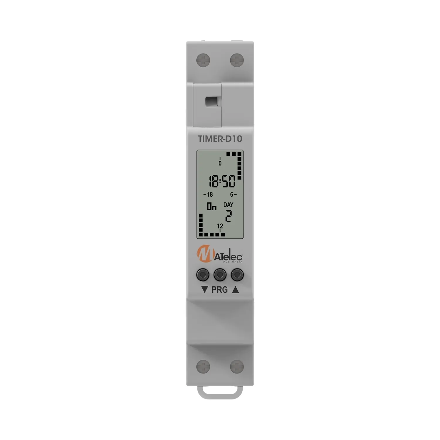 The Matelec TIMER-D10 is a 16A 7-day LCD programmable DIN rail timer designed for reliable weekly scheduling in switchboards and control panels. Operating on 240V AC, 50/60Hz, it provides flexible time control with up to 7 individual programs, allowing separate daily or grouped scheduling.