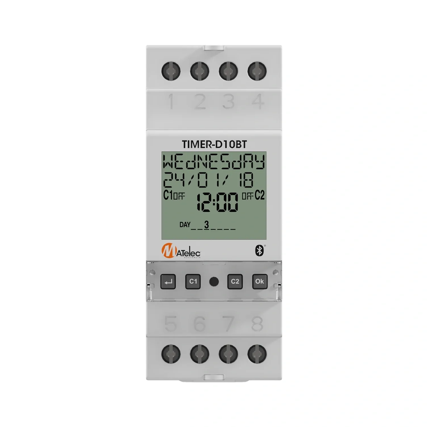 The Matelec TIMER-D10BT is a 16A 240V 7-day digital DIN rail timer with built-in Bluetooth connectivity for advanced scheduling and automation control. Designed for switchboard installation, it allows simple programming and adjustments via compatible iOS and Android apps for fast on-site setup.