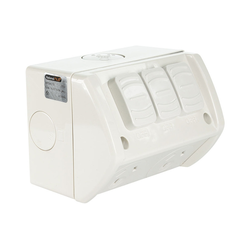 The NLS 30616 Double Weatherproof GPO 10 Amp c/w Extra Switch is perfect for exterior applications; they are rated at IP53 and build to last. Perfect for your patio or outdoor barbeque area.