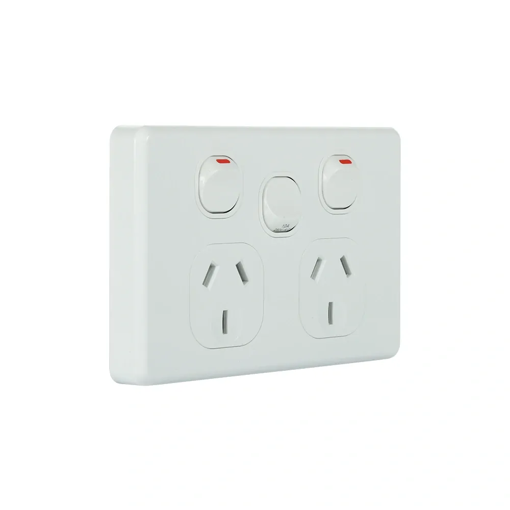 The NLS 30738 Double Pole Double Power Point 10A with Extra Switch combines standard outlets with added functionality. Rated at 250V AC, it features two sockets with double pole switching for added safety, along with an additional switch for controlling a light, fan, or appliance.
