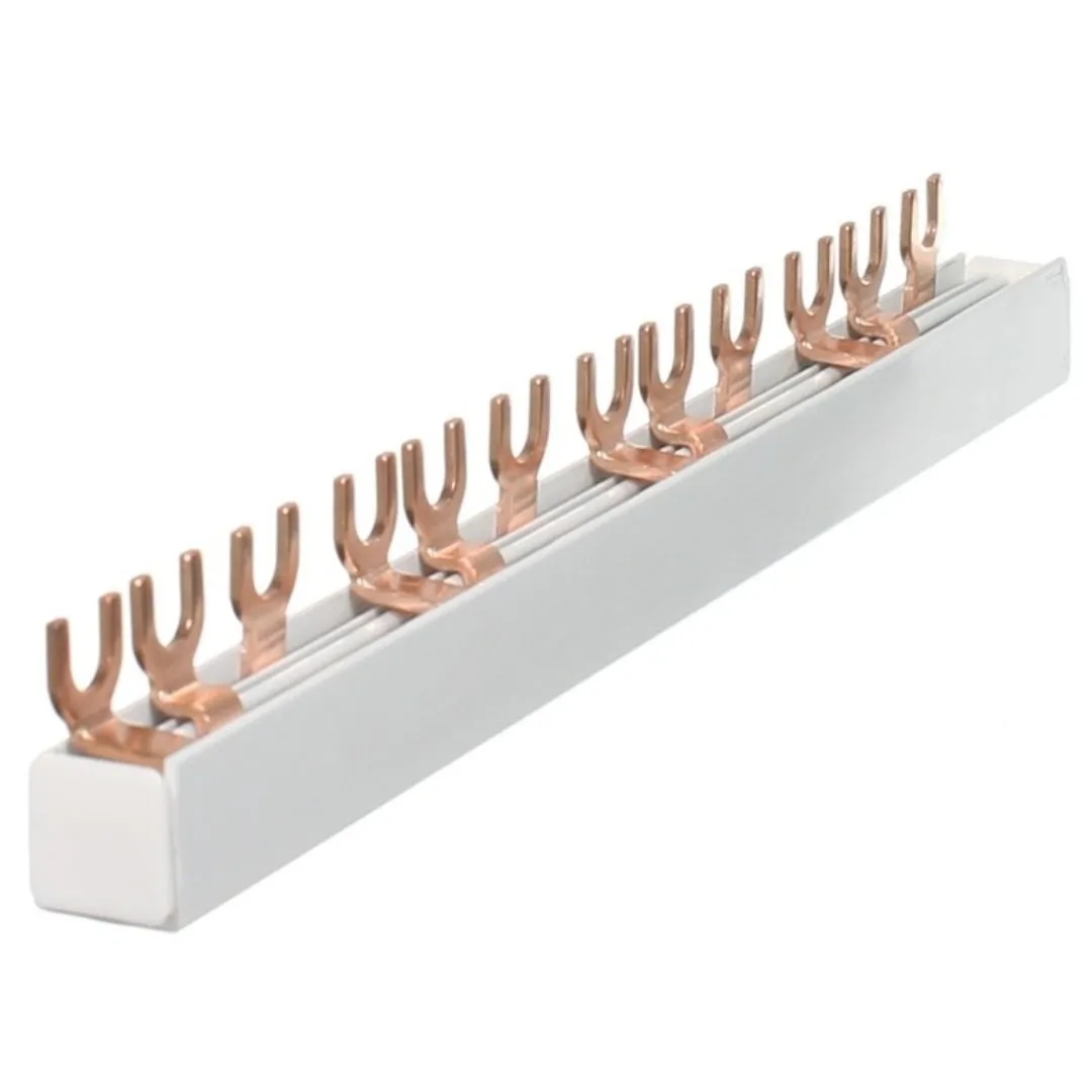 The NLS 30849 12 Pole 3 Phase Fork-Style Insulated Busbar provides 63A capacity for distributing power across three-phase circuits. With 10mm² cable compatibility and fork-style terminals, it supports safe, consistent connections using either screw or quick-connect devices. Its 222mm compact length fits neatly into standard switchboards, offering efficient multi-circuit linking.