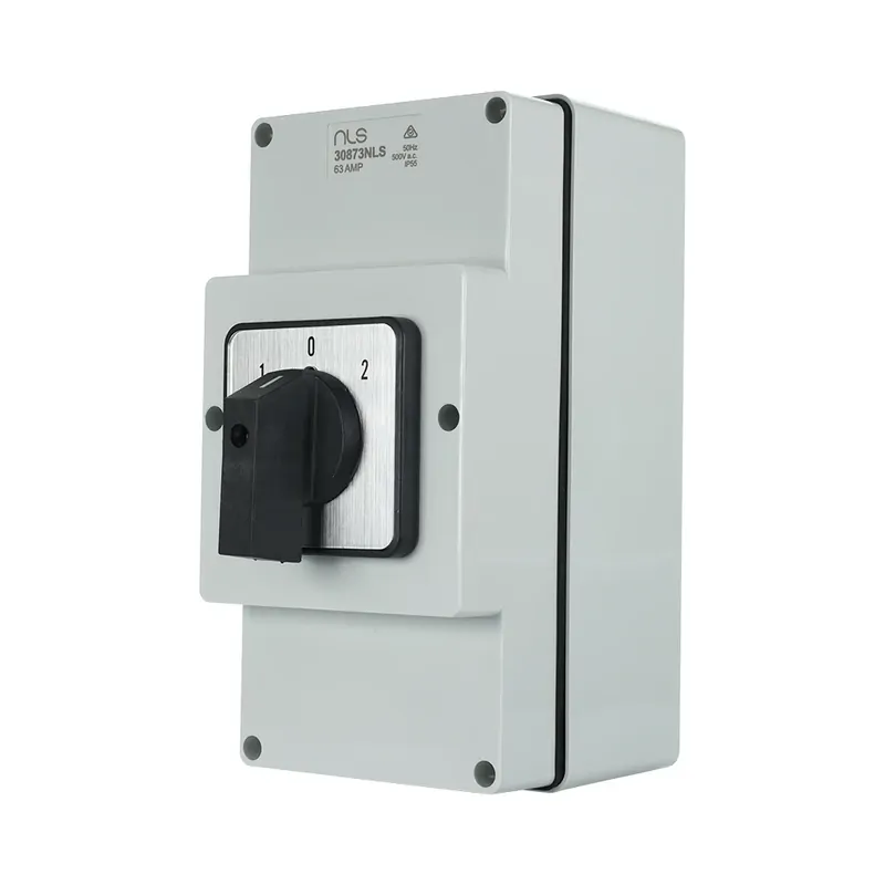 The NLS 30873 Changeover Switch 3 Pole 63A provides safe power transfer between the grid and an alternate source such as a generator. Its surface mount design supports straightforward installation, while the switch mechanism prevents backfeeding for reliable isolation. Housed in a durable grey enclosure, it carries an IP55 rating for protection against dust and water exposure.