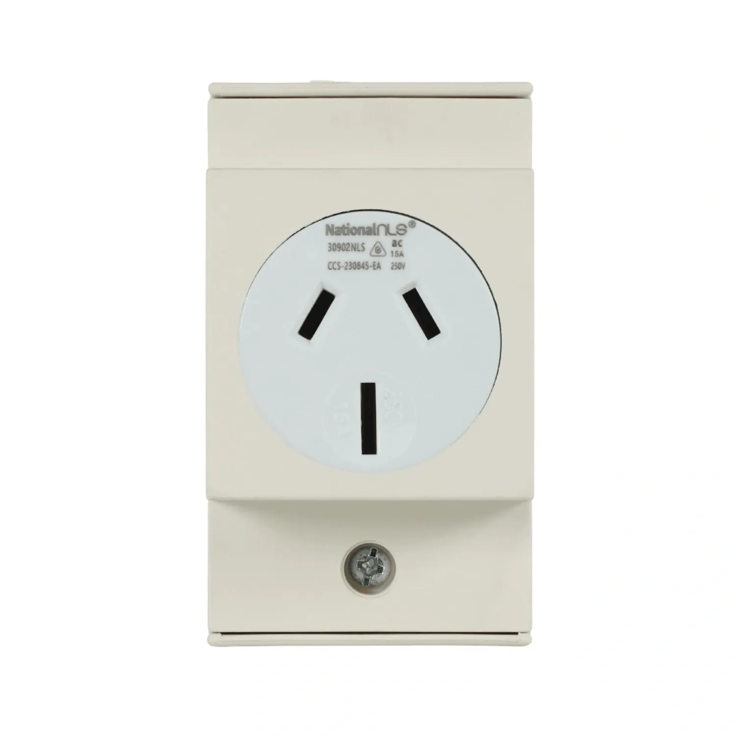 The NLS 30902 is used as an internal service outlet inside switchboards or enclosures, providing a 15A power point for tools or equipment during maintenance or testing.