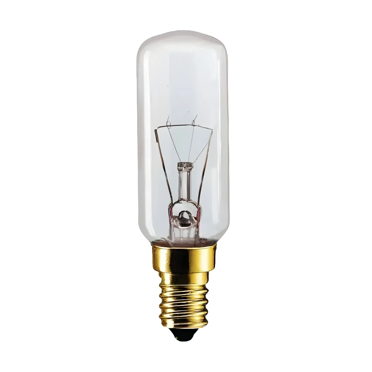 The Philips T25L40W240V is a clear incandescent tubular globe designed specifically for cooker hoods and other small appliance fittings. It uses an E14 small Edison screw base and operates at 40W, 230–240V, providing warm 2700K light with a nominal output of around 424 lumens for clear visibility over the cooktop.