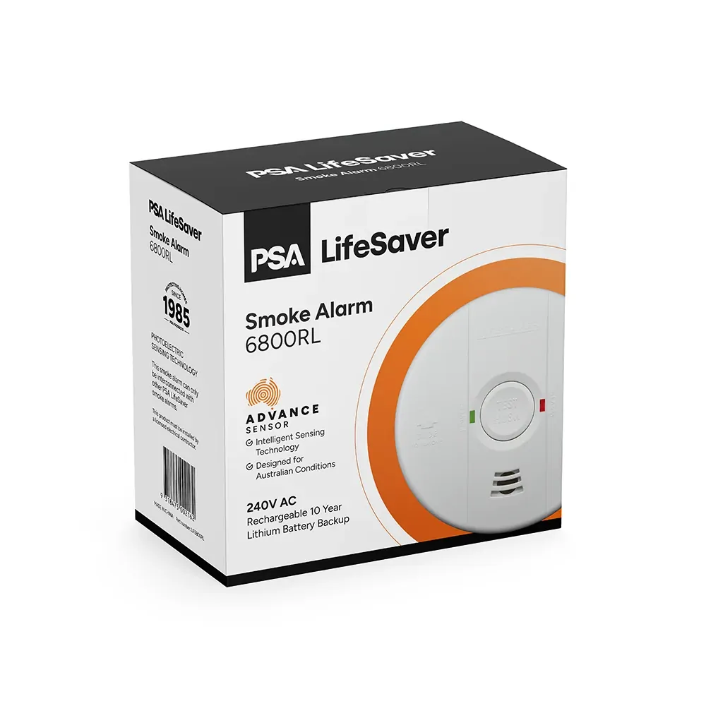 The PSA Lifesaver LIF6800RL is a 240V mains powered photoelectric smoke alarm with a 10-year rechargeable lithium battery backup, designed for long-term protection in residential properties. It uses advanced photoelectric sensor technology to detect smouldering fires early and reduce nuisance alarms. The unit can function as a standalone alarm or be interconnected with up to 24 compatible alarms for full-coverage alerting across a home.