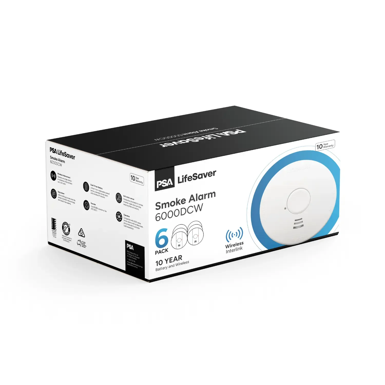 The PSA Lifesaver LIF6000DCW Smoke Alarm is a 10-year sealed lithium battery photoelectric smoke alarm with integrated wireless RF interlink for long-term protection in residential environments. It can operate as a standalone unit or interconnect wirelessly with up to 24 compatible alarms, enabling whole-home coverage without wiring.
