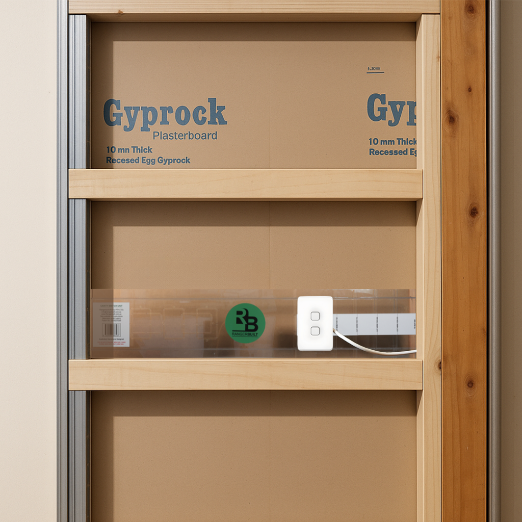 The RangerBuilt RCSU01 cavity switch unit is a smart solution for installing switches or GPOs on cavity sliding door walls, an area traditionally avoided for electrical fittings. Designed for 90mm to 100mm wall frames, this Australian-made unit safely enables vertical or horizontal switch placement without interfering with door operation.