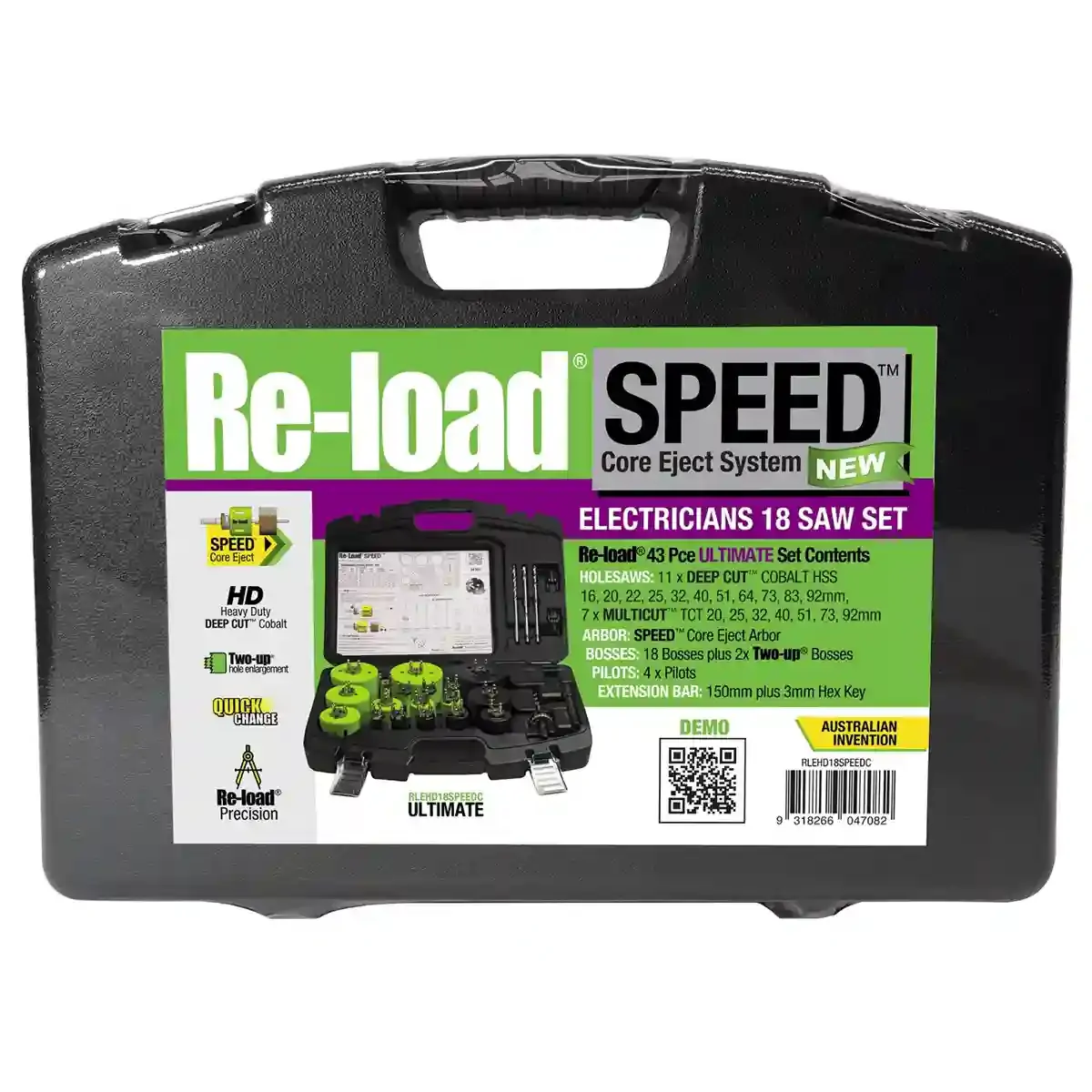 The Re-Load RLEHD18SPEEDC is a premium 45-piece electricians SPEED™ combo holesaw kit, built for high-performance drilling in a range of materials. Ideal for professional electricians and tradies, it features the SPEED™ Core Eject System - allowing fast pilot drill removal and core ejection with a push of a button.