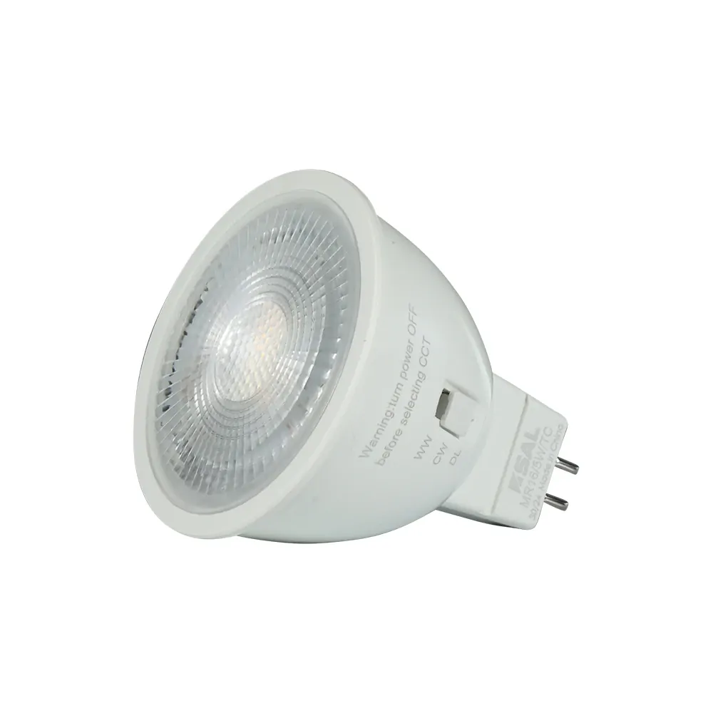 The SAL MR16-5W-TC is a 4W LED lamp with a GU5.3 base, designed for 12V AC/DC systems. It offers tri-colour output selectable between 3000K, 4000K, and 6000K, and delivers 360–400 lumens depending on the setting. Built with a die-cast aluminium body and frosted polycarbonate lens, it features a 38° beam angle for focused interior lighting. This non-dimmable LED is recommended for use with the SAL MINI60 transformer.